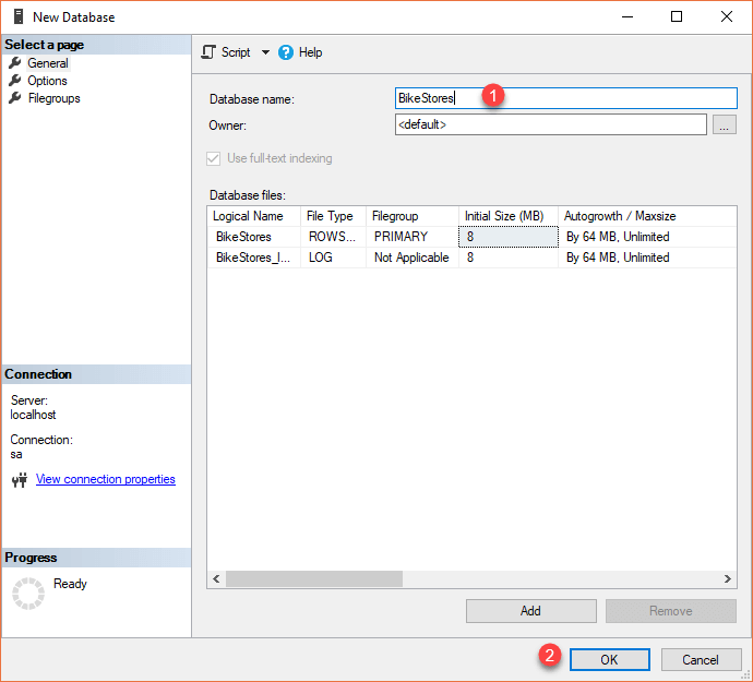 BikeStoresas the Database name. - Click OK to create the database.