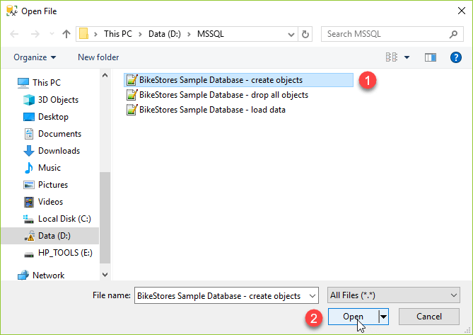 BikeStores Sample Database - create objects.sql– Creates schemas and tables.BikeStores Sample Database - load data.sql– Inserts data into the tables.BikeStores Sample Database - drop all objects.sql– Drops tables and schemas (for refresh/reset purposes).