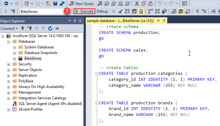 BikeStoresdatabase. - Created schemas and tables using the provided SQL script.